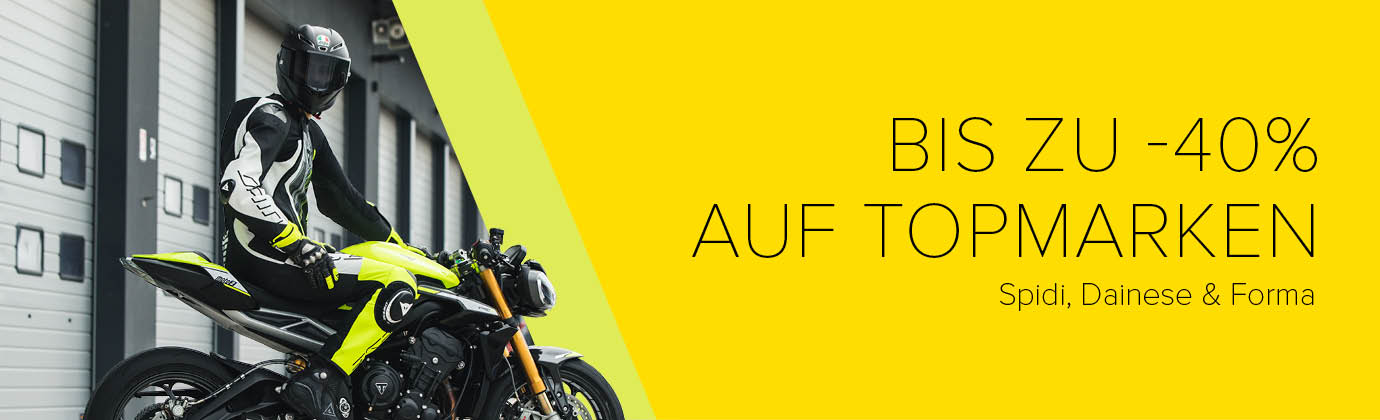 Große Marken, starke Rabatte: Das gesamte Sortiment von SPIDI und DAINESE ist jetzt um -40% reduziert! Auch für deine neuen Stiefel ist gesorgt: -25% auf alle Artikel von FORMA. Perfekt, um deine Gear kurz vor dem Saisonstart noch aufzurüsten.