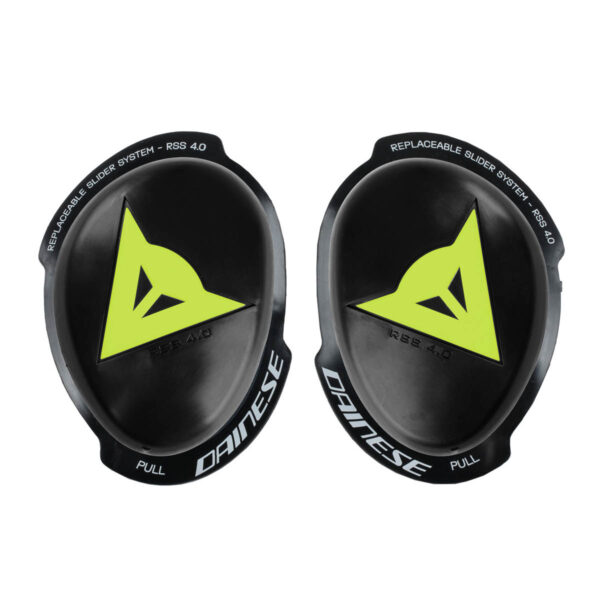 Komplettes Knieslider-Set mit Replaceable Slider System (RSS), kompatibel mit Dainese-Lederanzügen. Mit Klettverschluss zur Befestigung am Anzug und Slider zur Befestigung an der Basis.