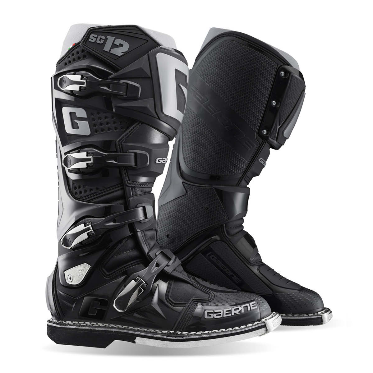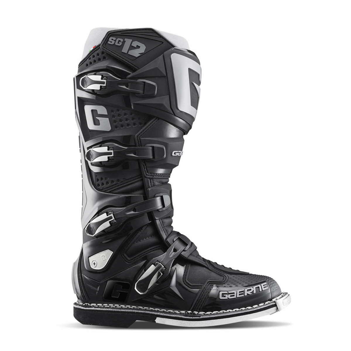 Der Gaerne SG12 ist der Ultimative Motocross Stiefel. Um eine Überdehnung oder Überkompression zu verhindern bietet das DSPS (Dual Stage Pivot System) einen sehr guten seitlichen Halt. Die Schienbeinplatte ist aus PU gespritzt, während die Fersenkappe für einen besseren Schutz und höheren Komfort sorgt. Der Zehenbereich wurde so geformt, dass man stets ein gutes Gefühl beim Schalten hat. Für einen optimalen Halt sorgen die vier leichten und austauschbaren Verschlussschnallen. Der Klettverschluss am oberen Bund des Stiefels sorgt für eine sichere Passform. Die hitzebeständige Polsterung an der Innenseite trägt ebenso zu einem guten Halt bei. Der vordere Teil des SG12 ist für eine gute Belüftung ausgelegt, was die Luftzirkulation im Inneren fördert. Die robuste Gaerne Goodyear Welted Sohle sorgt für eine langlebige Sohlenkonstruktur. Der SG12-Stiefel ist CE-zertifiziert gemäß EN 13634:2017 und der Verordnung EU 2016/425.