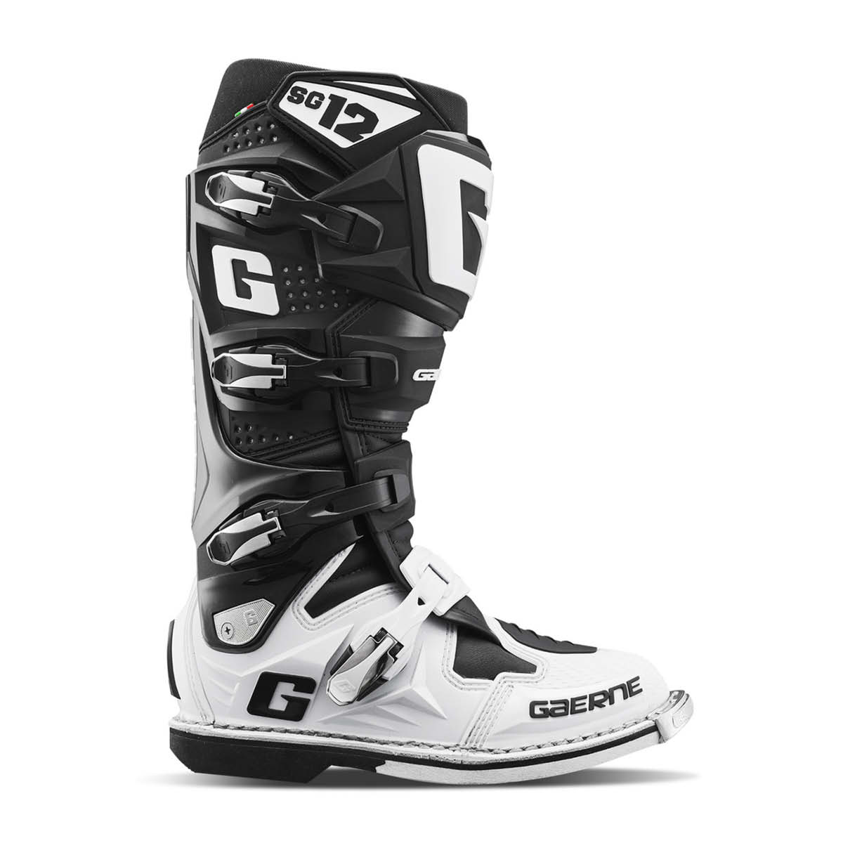 Der Gaerne SG12 ist der Ultimative Motocross Stiefel. Um eine Überdehnung oder Überkompression zu verhindern bietet das DSPS (Dual Stage Pivot System) einen sehr guten seitlichen Halt. Die Schienbeinplatte ist aus PU gespritzt, während die Fersenkappe für einen besseren Schutz und höheren Komfort sorgt. Der Zehenbereich wurde so geformt, dass man stets ein gutes Gefühl beim Schalten hat. Für einen optimalen Halt sorgen die vier leichten und austauschbaren Verschlussschnallen. Der Klettverschluss am oberen Bund des Stiefels sorgt für eine sichere Passform. Die hitzebeständige Polsterung an der Innenseite trägt ebenso zu einem guten Halt bei. Der vordere Teil des SG12 ist für eine gute Belüftung ausgelegt, was die Luftzirkulation im Inneren fördert. Die robuste Gaerne Goodyear Welted Sohle sorgt für eine langlebige Sohlenkonstruktur. Der SG12-Stiefel ist CE-zertifiziert gemäß EN 13634:2017 und der Verordnung EU 2016/425.