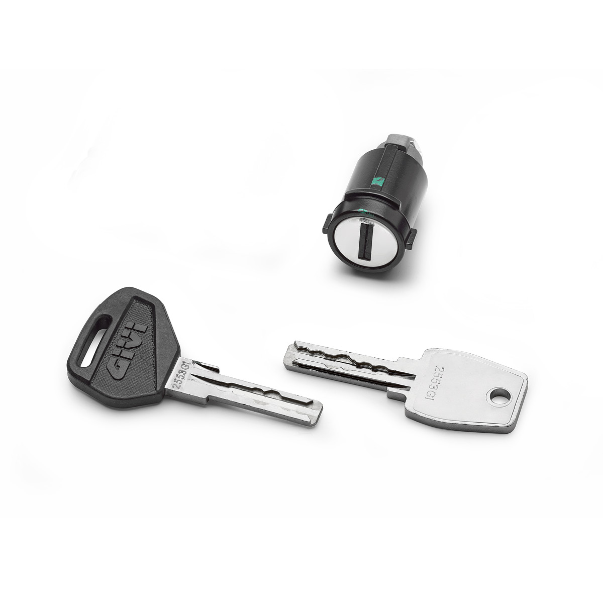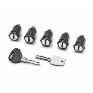 GIVI Smart Security Lock Set, einschließlich Schlüssel mit Logo, Metall-Ersatzschlüssel und kodierter Schließzylinder.